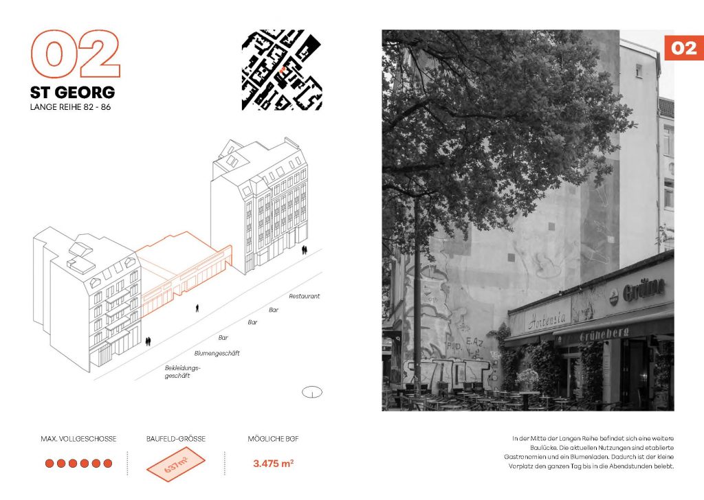 Im zweiten Band wird der Kontext des aus-gewählten Entwurfsgrundstück in drei Zoom-Stufen näher untersuchen. Zunächst wird der Stadtteil St. Georg aus verschiedenen Blick-winkeln betrachten, um ein Verständnis für die Besonderheiten und Herausforderungen dieses Viertels zu entwickeln. Dabei werden historische, soziale und städtebauliche Aspekte berück-sichtigt. Im zweiten Schritt verkleinert sich der Fokus auf die Lange Reihe, die Straße, in der sich das Grundstück befindet. Diese Straße spielt eine Schlüsselrolle in der urbanen Struktur St.Georgs und wird hinsichtlich ihrer Bedeutung für das Viertel, aber auch aufkommender Probleme betrachtet. Abschließend widmen wir uns dem Grundstück Lange Reihe 82-86 selbst. Die aktuelle Nutzung und räumlichen Zusammenhänge der Bestands-bauten stehen dabei im Fokus.Ziel ist es, als Basis für den Entwurfsprozess,ein tiefergehendes Verständnis für die Potenziale und Herausforderungen zu schaffen, die der Entwurskontext bietet.