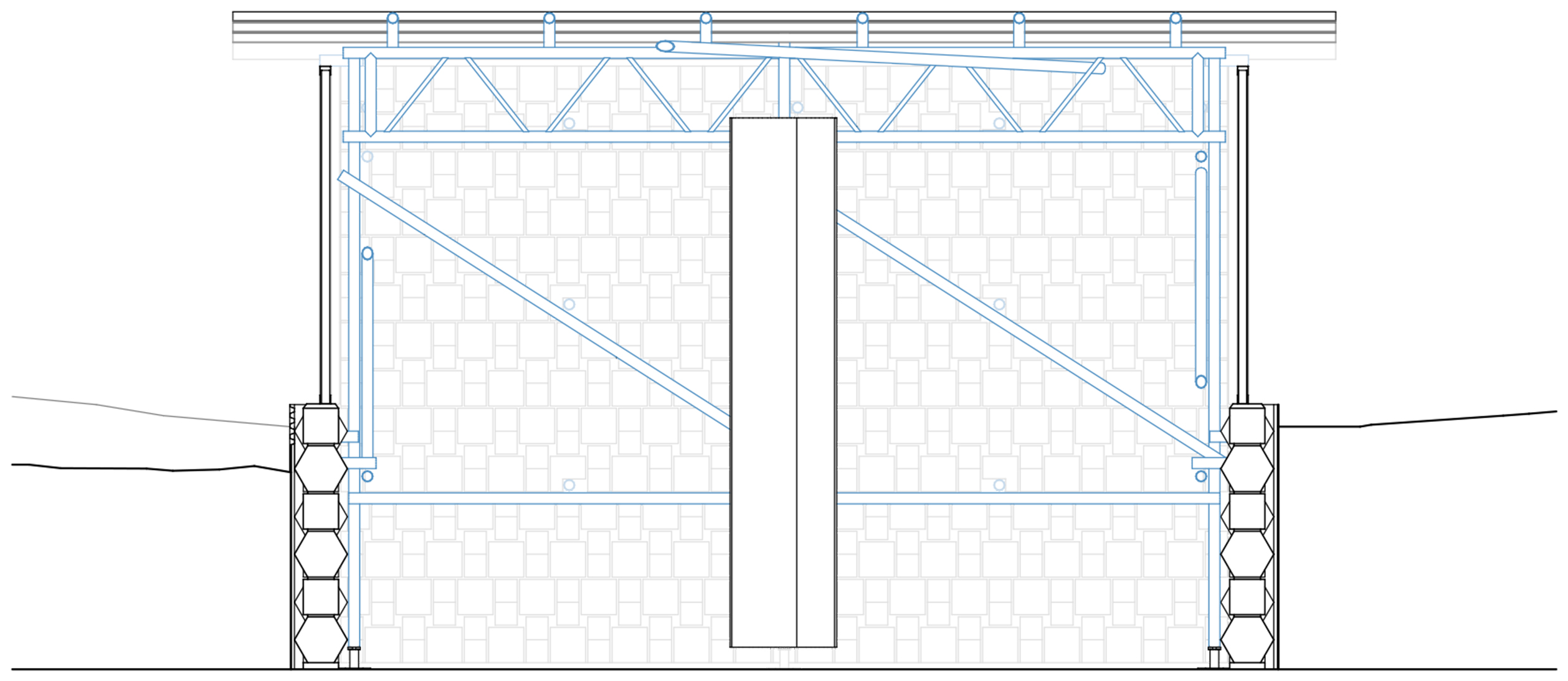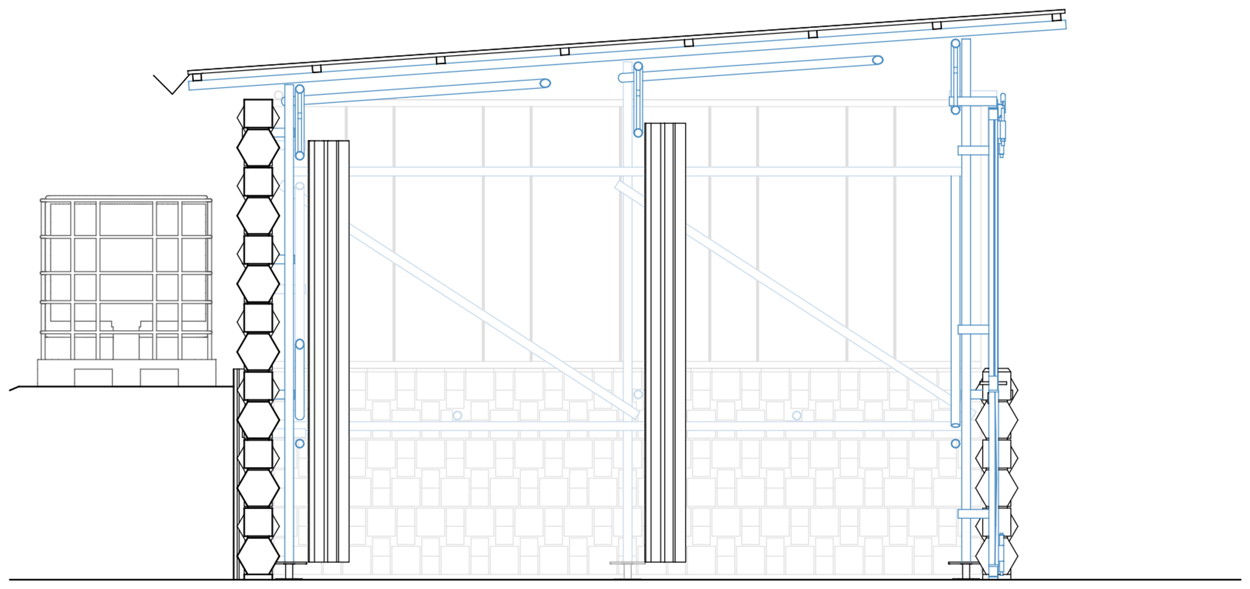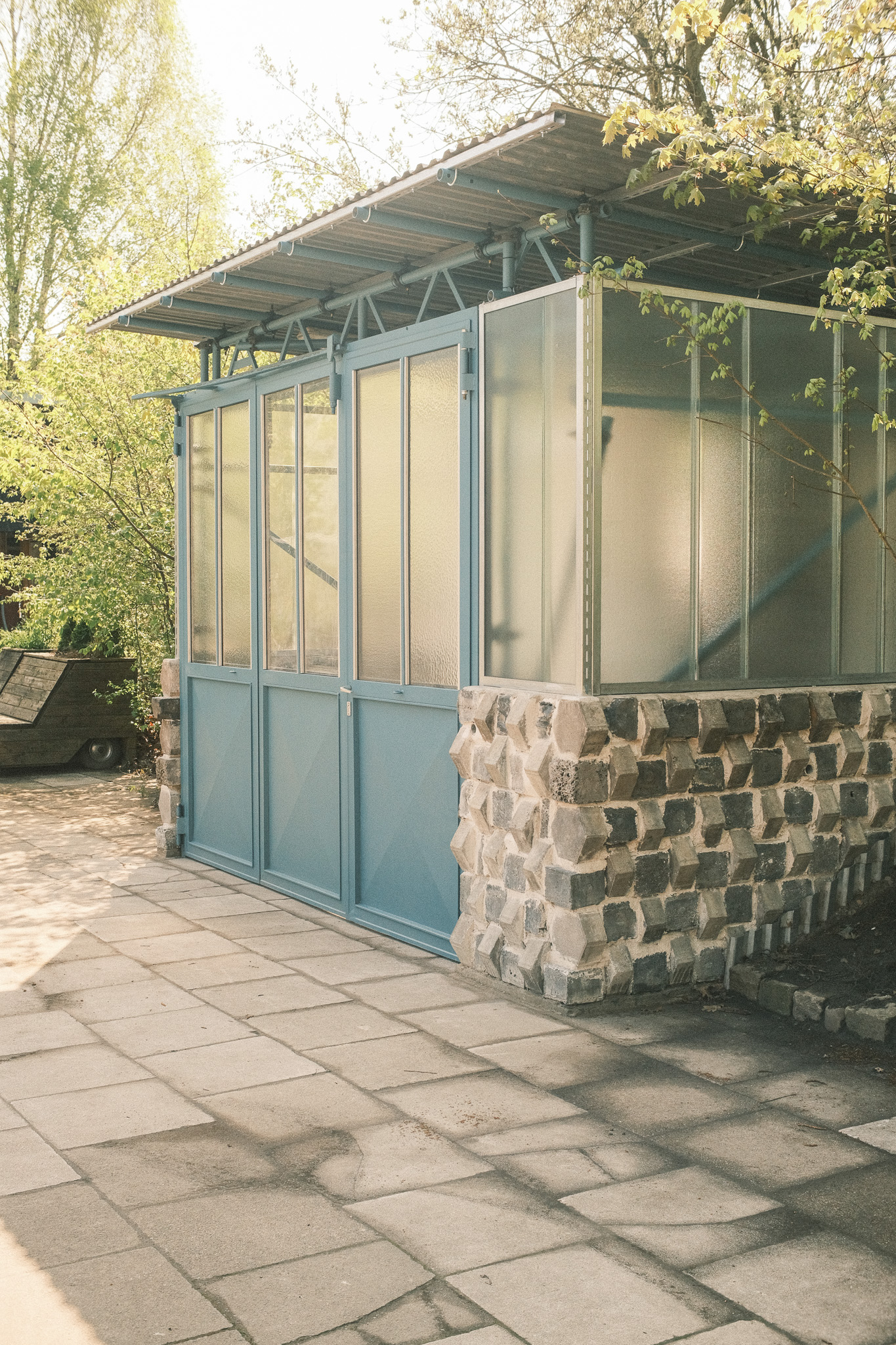 Das Gerüst als Haupttragwerk fand sich während einer Materialkatalogisierung auf dem Baugrundstück. Gemeinsam mit dem ersten erfolgreichen Materialfund, einem alten Falttor, konnten die finalen Dimensionen des Gebäudes sowie die Oberkanten des Sockels und der Glasfassade festgelegt werden. Der Sockel entstand schließlich aus einem eigens entwickelten Verband aus Schlacke- und Wabensteinen, die ebenfalls auf dem Gelände als Reste des gepflasterten Hofs zu finden waren. Für die Glasfassade wurden recycelte Profilglas-Elemente verwendet, welche mit Trockenbau-Aussteifungsprofilen (UA-Profilen) gerahmt wurden. Diese mussten als einziges Baumaterial (ausgenommen Verbrauchsmaterialien) neu angeschafft werden, können jedoch durch verschraubte Verbindungen später ihrem ursprünglichen Verwendungszweck im Trockenbau wieder zugeführt werden. Das Dach wurde mit recyceltem Trapezblech eines alten Carports gedeckt.