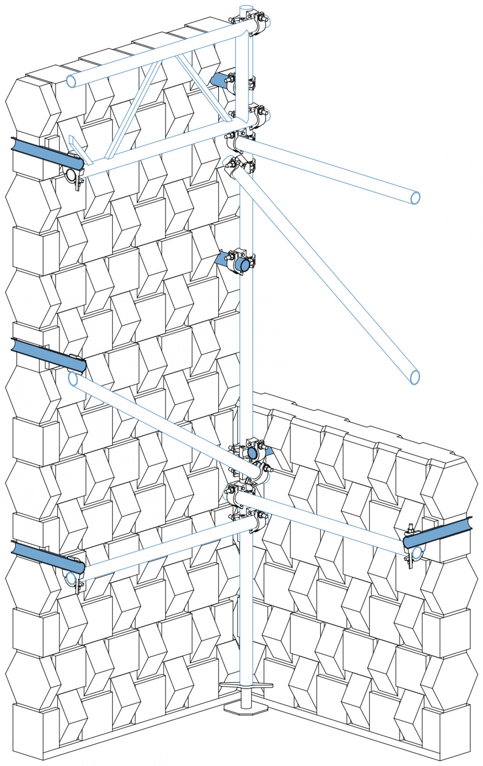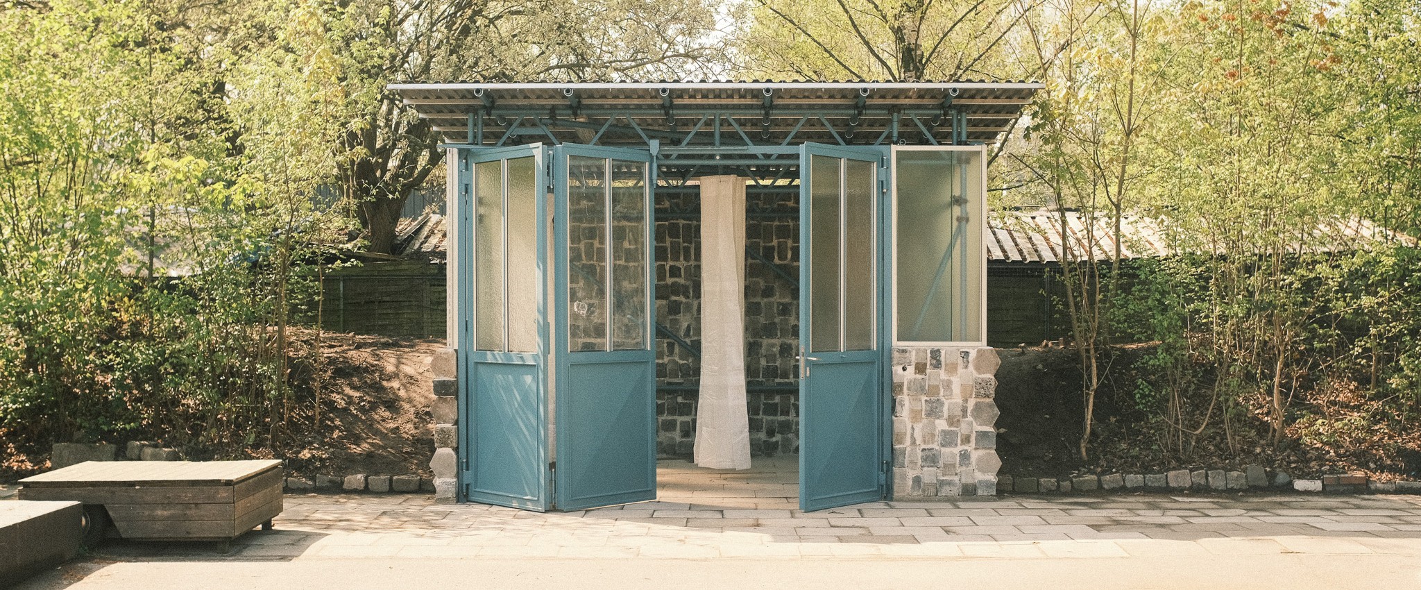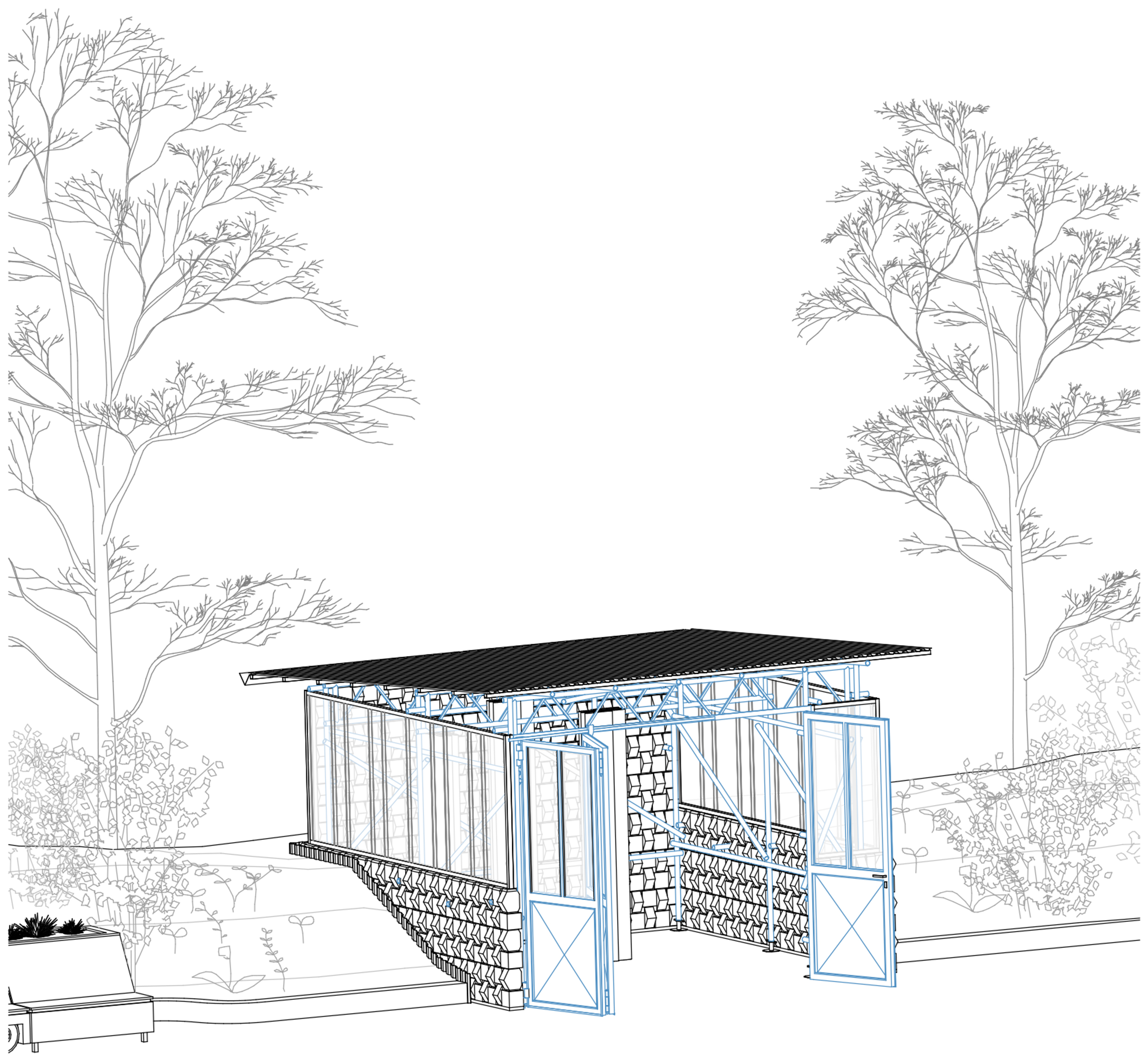 Das Gerüst als Haupttragwerk fand sich während einer Materialkatalogisierung auf dem Baugrundstück. Gemeinsam mit dem ersten erfolgreichen Materialfund, einem alten Falttor, konnten die finalen Dimensionen des Gebäudes sowie die Oberkanten des Sockels und der Glasfassade festgelegt werden. Der Sockel entstand schließlich aus einem eigens entwickelten Verband aus Schlacke- und Wabensteinen, die ebenfalls auf dem Gelände als Reste des gepflasterten Hofs zu finden waren. Für die Glasfassade wurden recycelte Profilglas-Elemente verwendet, welche mit Trockenbau-Aussteifungsprofilen (UA-Profilen) gerahmt wurden. Diese mussten als einziges Baumaterial (ausgenommen Verbrauchsmaterialien) neu angeschafft werden, können jedoch durch verschraubte Verbindungen später ihrem ursprünglichen Verwendungszweck im Trockenbau wieder zugeführt werden. Das Dach wurde mit recyceltem Trapezblech eines alten Carports gedeckt.