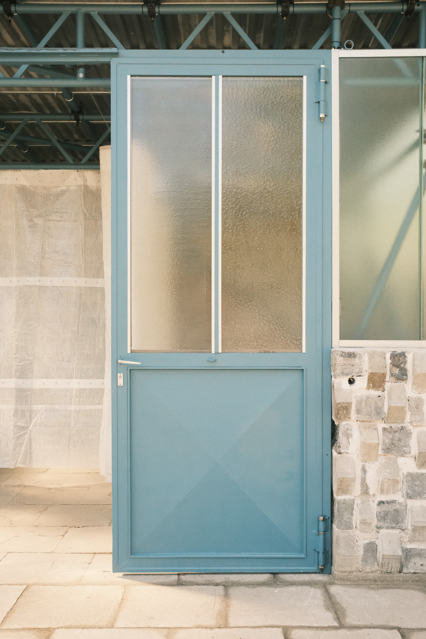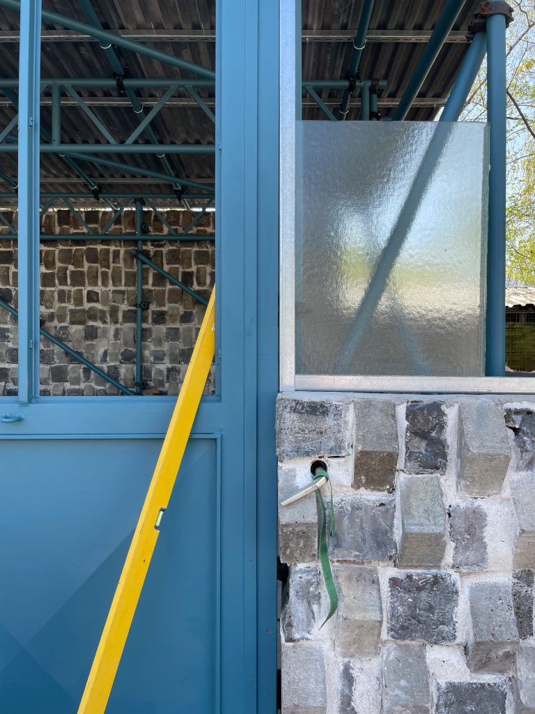 Da das Gebäude zudem vollständig durch das Projektteam realisiert wurde, musste keine vollständige Detailplanung auf dem Papier ausgearbeitet werden, sondern es konnten bei der Ausführungsplanung einige Spielräume offengehalten werden um während des Baus vor Ort die letzten Details zu lösen. Im Sinne des DesignBuild Konzepts ließ sich also auch während des Baus noch der Entwurf verändern und verfeinern. Dies war gerade hilfreich, wenn man vor Herausforderungen wie einer anders gelieferten Lackfarbe oder Produktionsvarianzen in Gläsern und Profilen gestellt wurde. Viele Fügungen hatten wurden zuvor geplant und skizziert, konnten jedoch erst bei der Montage finalisiert werden.
