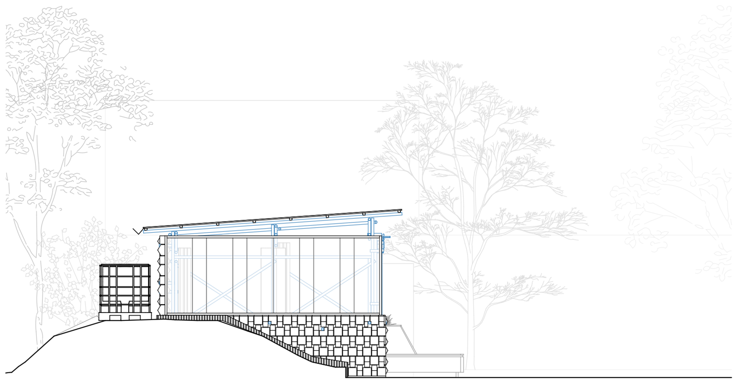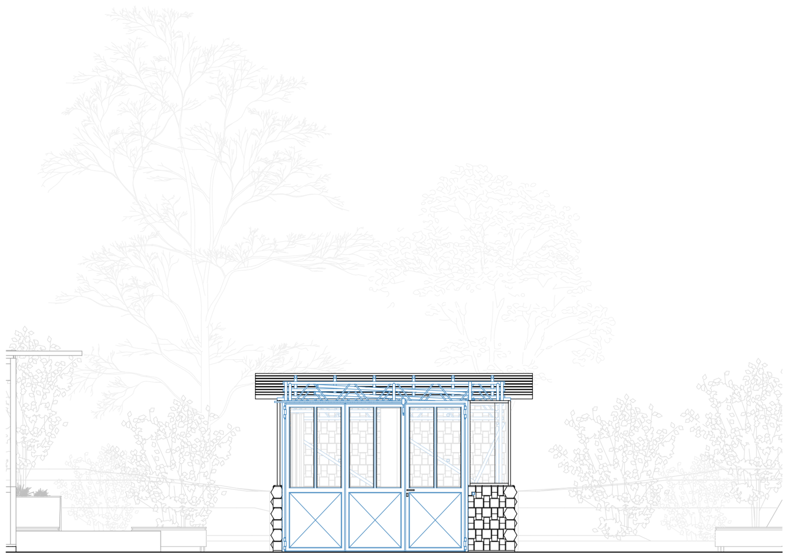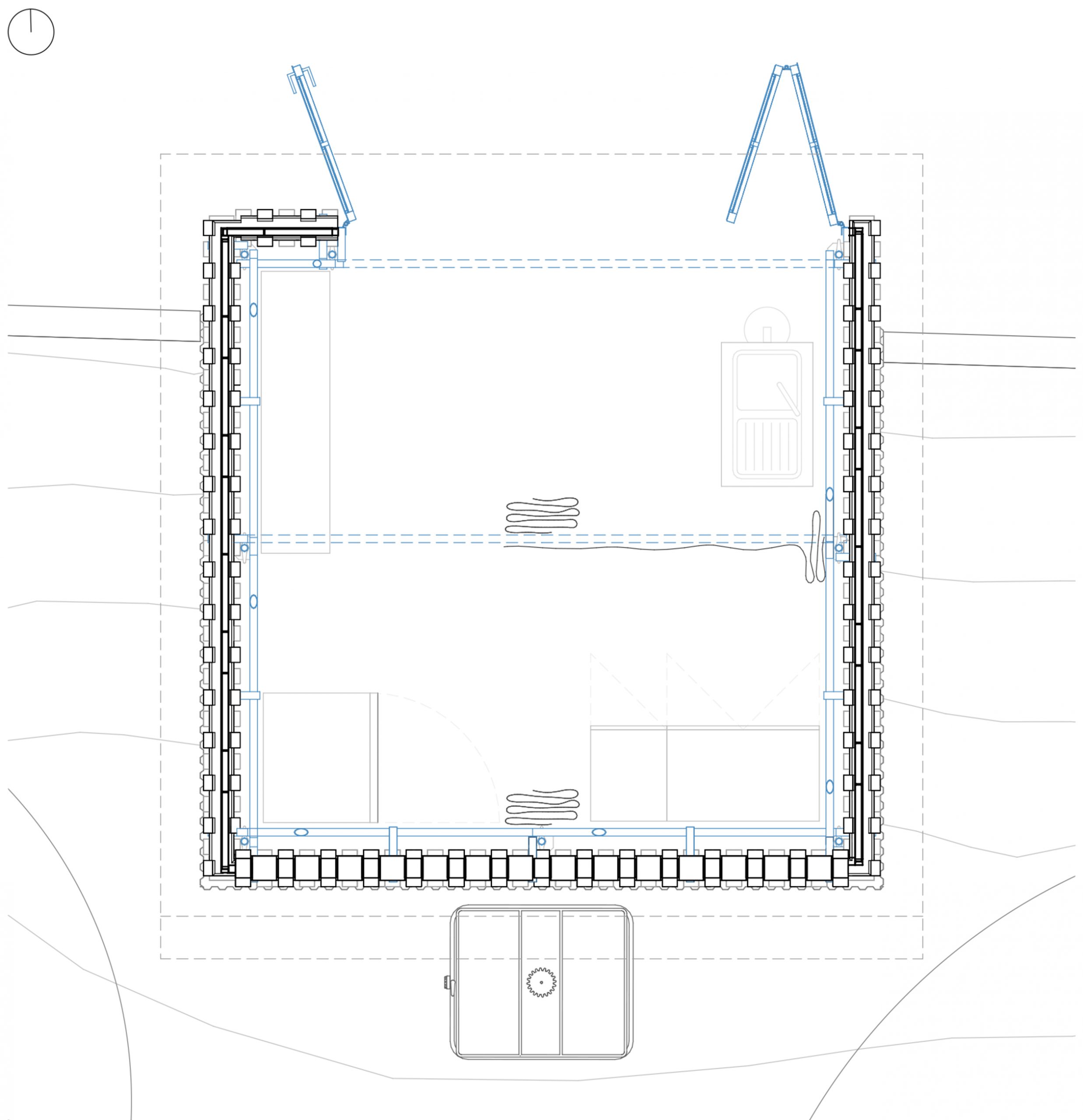 Jedoch auch eine Werkstatt und vor allem ein Ort zur Vorbereitung der Biomasse und zur Weiterverarbeitung des produzierten Biogases. Daraus entstand ein quadratischer Grundriss, der durch einen transparenten Vorhang in vier Teile getrennt werden kann. In der hinteren Hälfte des Gebäudes, an der hohen Rückwand, ist die Lagerung von Messgeräten und Werkzeugen, sowie die gekühlte Lagerung der Lebensmittelreste vorgesehen. Im vorderen Teil, an dem vollständig öffenbaren Falttor, befindet sich ein abtrennbarer Raum zum Schreddern der Lebensmittelreste, sowie ein Bereich zum Abfüllen des Biogases und ein universell nutzbarer Werkstattplatz.