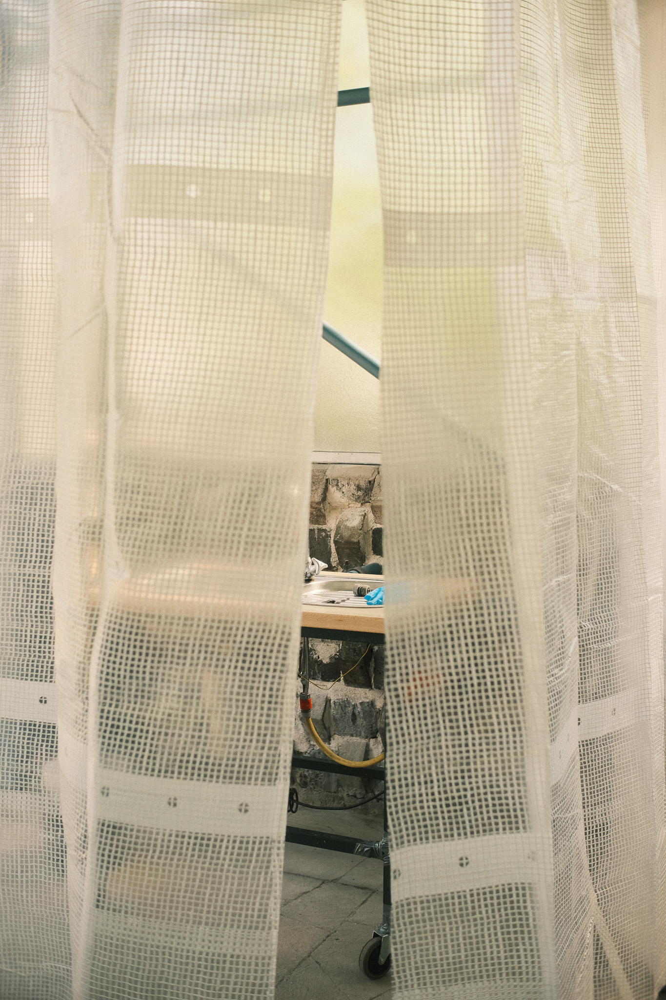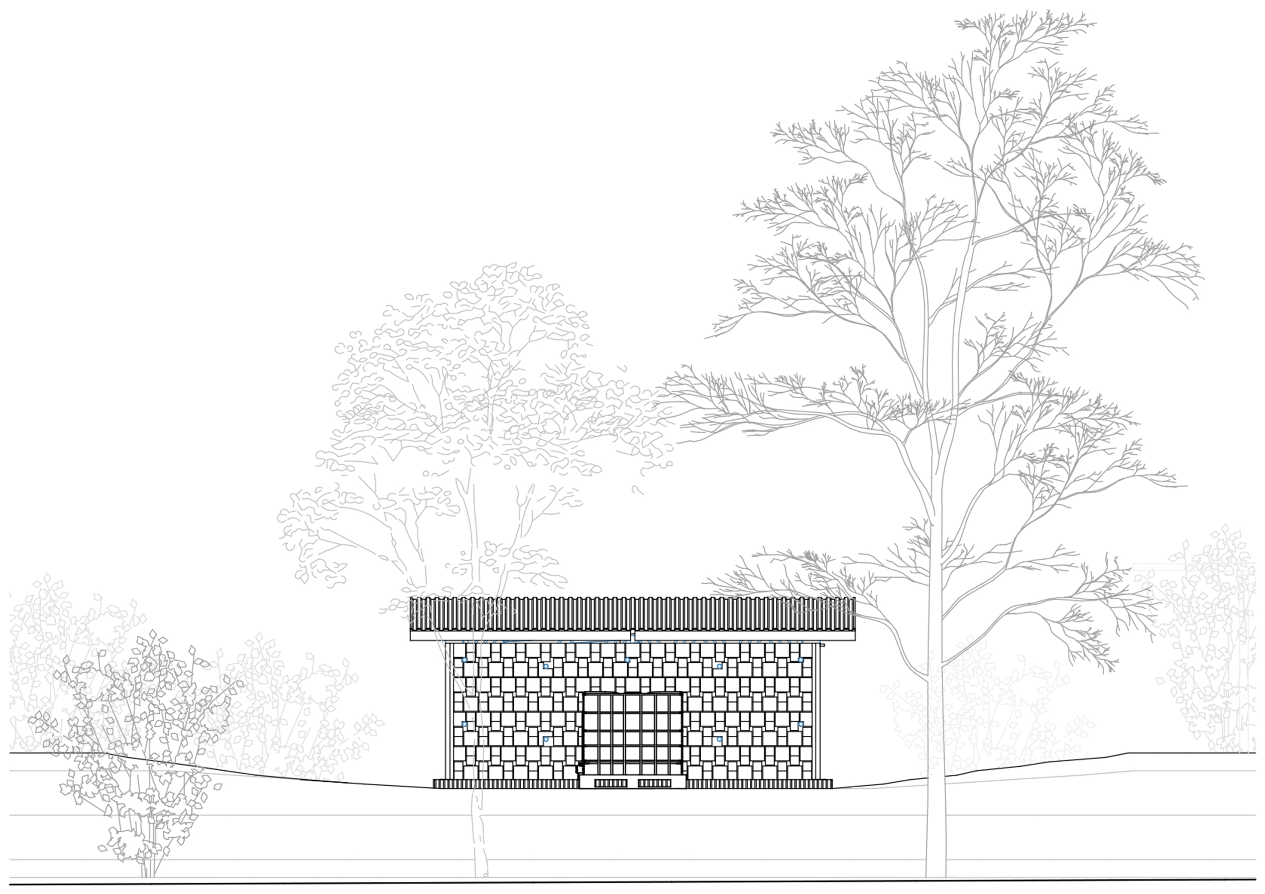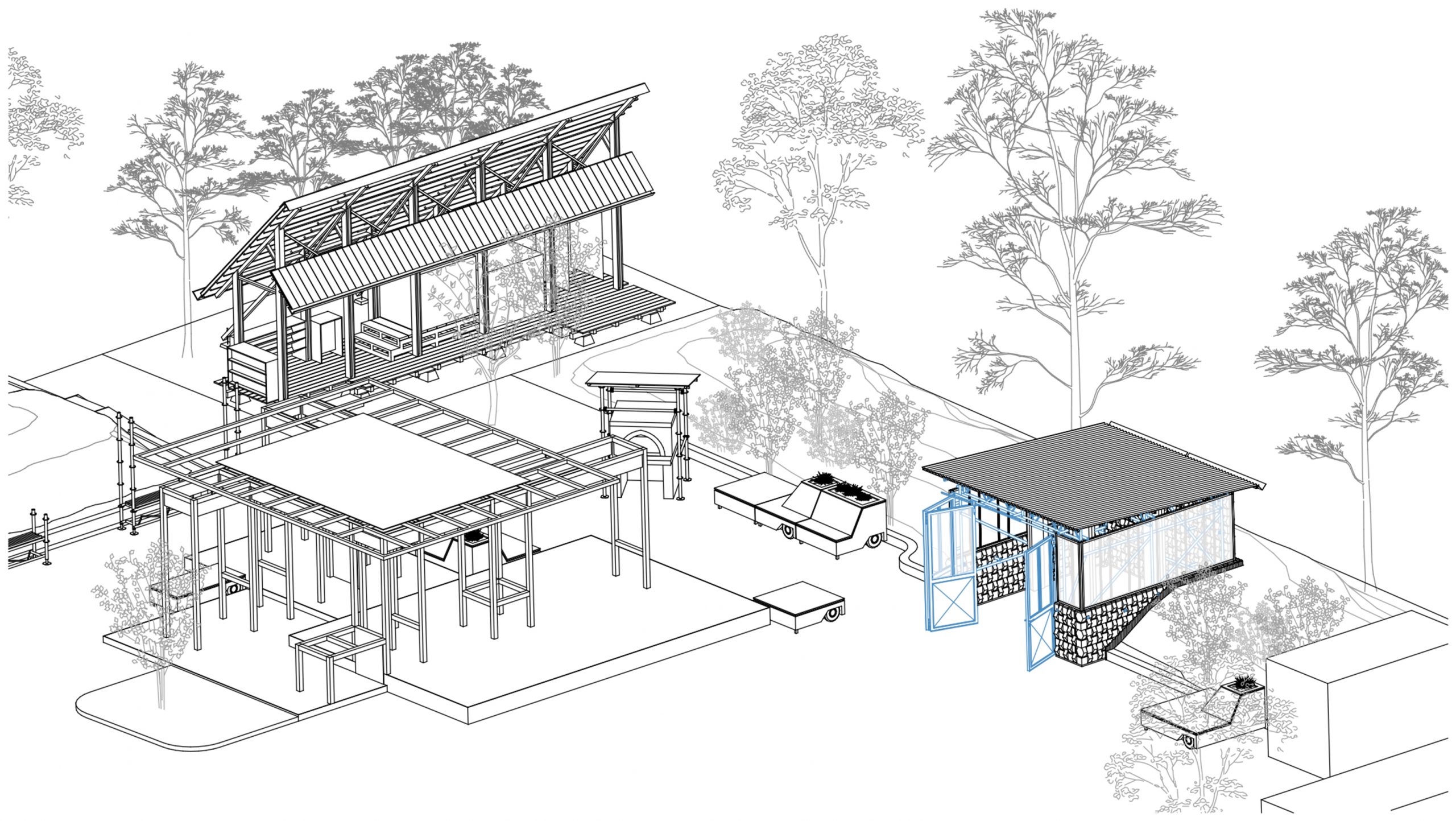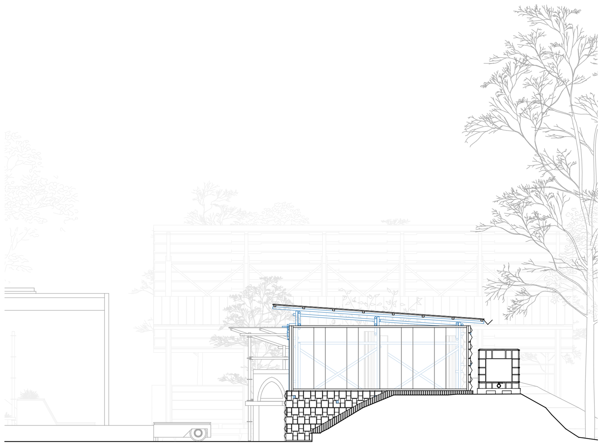 Jedoch auch eine Werkstatt und vor allem ein Ort zur Vorbereitung der Biomasse und zur Weiterverarbeitung des produzierten Biogases. Daraus entstand ein quadratischer Grundriss, der durch einen transparenten Vorhang in vier Teile getrennt werden kann. In der hinteren Hälfte des Gebäudes, an der hohen Rückwand, ist die Lagerung von Messgeräten und Werkzeugen, sowie die gekühlte Lagerung der Lebensmittelreste vorgesehen. Im vorderen Teil, an dem vollständig öffenbaren Falttor, befindet sich ein abtrennbarer Raum zum Schreddern der Lebensmittelreste, sowie ein Bereich zum Abfüllen des Biogases und ein universell nutzbarer Werkstattplatz.