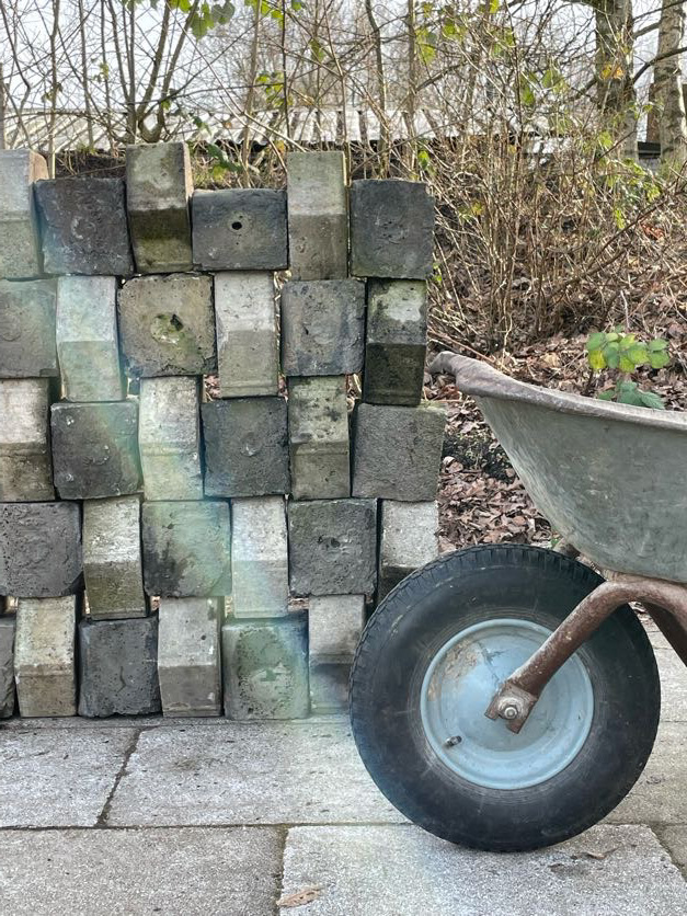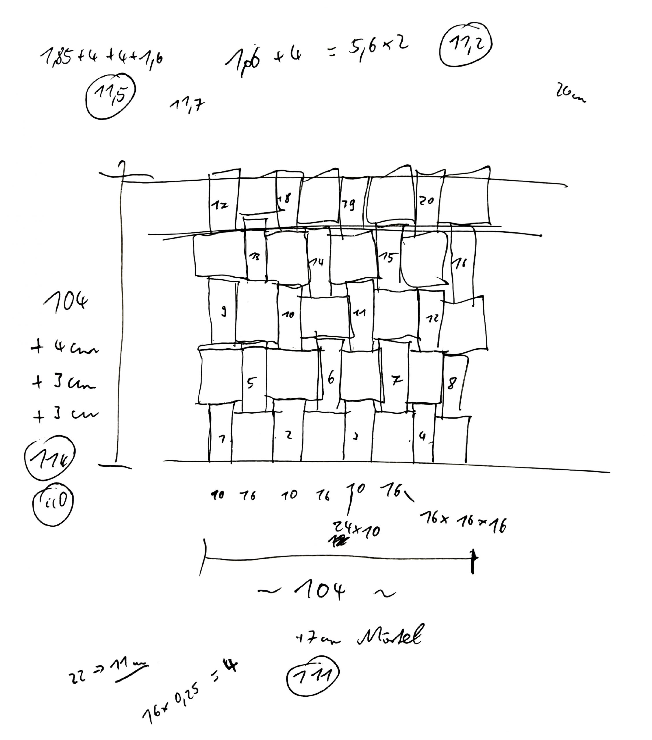 Da das Projekt nicht aus einem bestehenden Materialpool heraus entstand, war die Suche und Akquise von wiederverwendbaren Baumaterialien großer Bestandteil des Entwurfsprozesses. Es ergab sich ein Wechselspiel, in dem Entwurf und die aktuellen Materialverfügbarkeiten sich gegenseitig beeinflussten. Um sich nicht von Verfügbarkeiten einschränken zu lassen, war es während des Entwurfes nötig zunächst nicht mit spezifischen Materialien, sondern mit Eigenschaften und Materialgruppen zu planen: