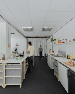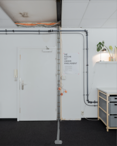 In Kooperation mit dem Fachgebiet Architektur, Raum und Gesellschaft von V. Prof. Dr. Sabine Hansmann an der HafenCity Universität Hamburg hat vonwegenleer ein Reallabor umgesetzt, um genau das zu testen. Für sechs Monate stand dafür eine leerstehende Büroetage am Alten Fischmarkt zur Verfügung. Im Rahmen des Master-Entwurfskurses „Reallabor: Wohnen Radikal Experimentell“ entwickelten Studierende temporäre, reversible Wohnstrukturen und bezogen die Fläche im Juli 2025 mit den Kollektiv vonwegenleer für vier Wochen.