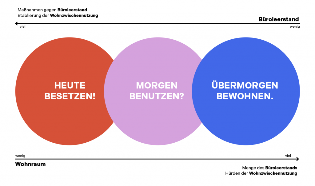 Mit Pop-Up Wohnen stellen wir eine neue Form des Wohnens vor. In leerstehenden Büroflächen soll sich Wohnen als Zwischennutzung etablieren und damit eine Antwort auf die Wohnungsfrage und eine Lösung für einen nachhaltigen Umgang mit Bestandsgebäuden bieten. In der theoretischen Arbeit werden Wohnungsnot und Büroleerstand als Probleme erkannt und es wird analysiert, inwiefern Wohnzwischennutzung in Bürogebäuden funktionieren kann. Drei Bachelorarbeiten bieten innerhalb dreier Strategien zur Wohnzwischennutzung eine organisatorische und architektonische Antwort. Sie beschreiben jeweils eine Entwicklungsphase des Prozesses von der illegalen Hausbesetzung über eine provisorische Wohnzwischennutzung zu einer etablierten Wohnform.